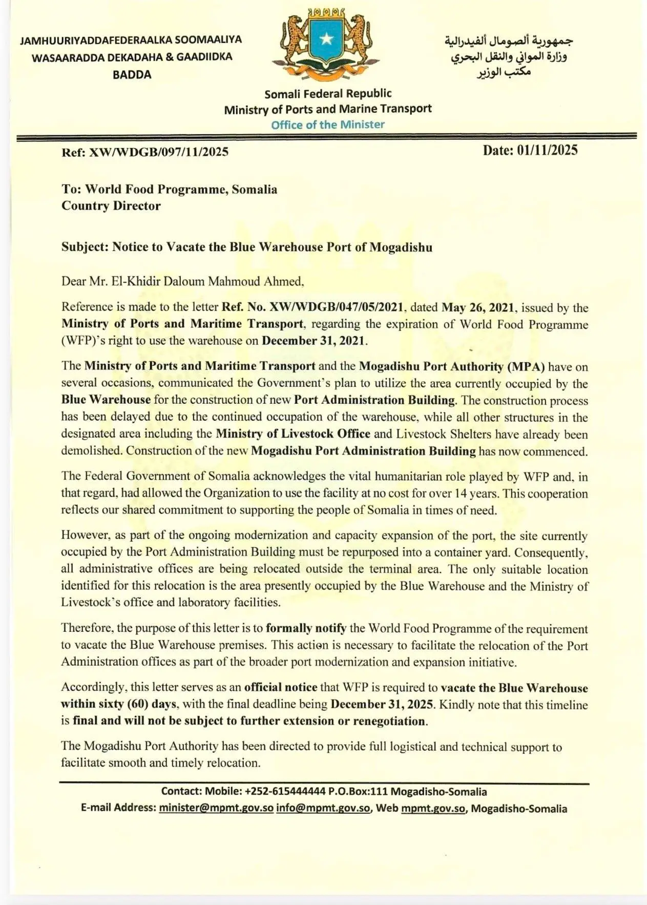Sidoo kale, warqad loo diray agaasimaha WFP ee Soomaaliya, ayaa muujinaysa in Wasaaradda Dekedaha iyo Gaadiidka Badda ay bishii Nofeembar si rasmi ah ugu wargelisay WFP in bakhaarka laga guuro ugu dambayn 31-ka Diseembar, taas oo la xiriirta qorshe lagu balaarinayo xafiisyada dekedda.