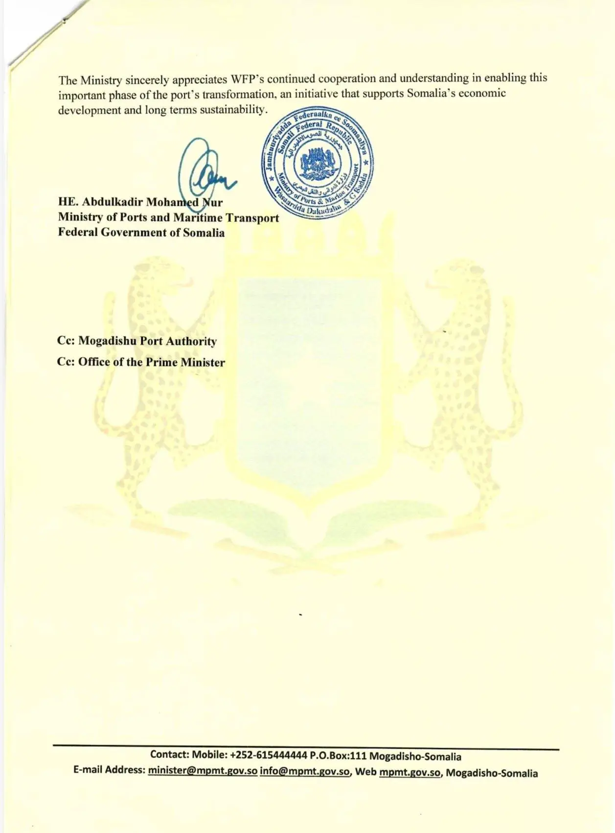 Qoraal rasmi ah oo wareejin shixnad ah oo ka yimid Maamulka Dekedda Muqdisho, kuna taariikhaysan 7 bishaan isla markaana ay aragtay Reuters, ayaa caddeynaya in WFP ay si buuxda ula wareegtay cuntada, taas oo horay looga raray bakhaarka buluugga ah loona wareejiyay bakhaar kale.