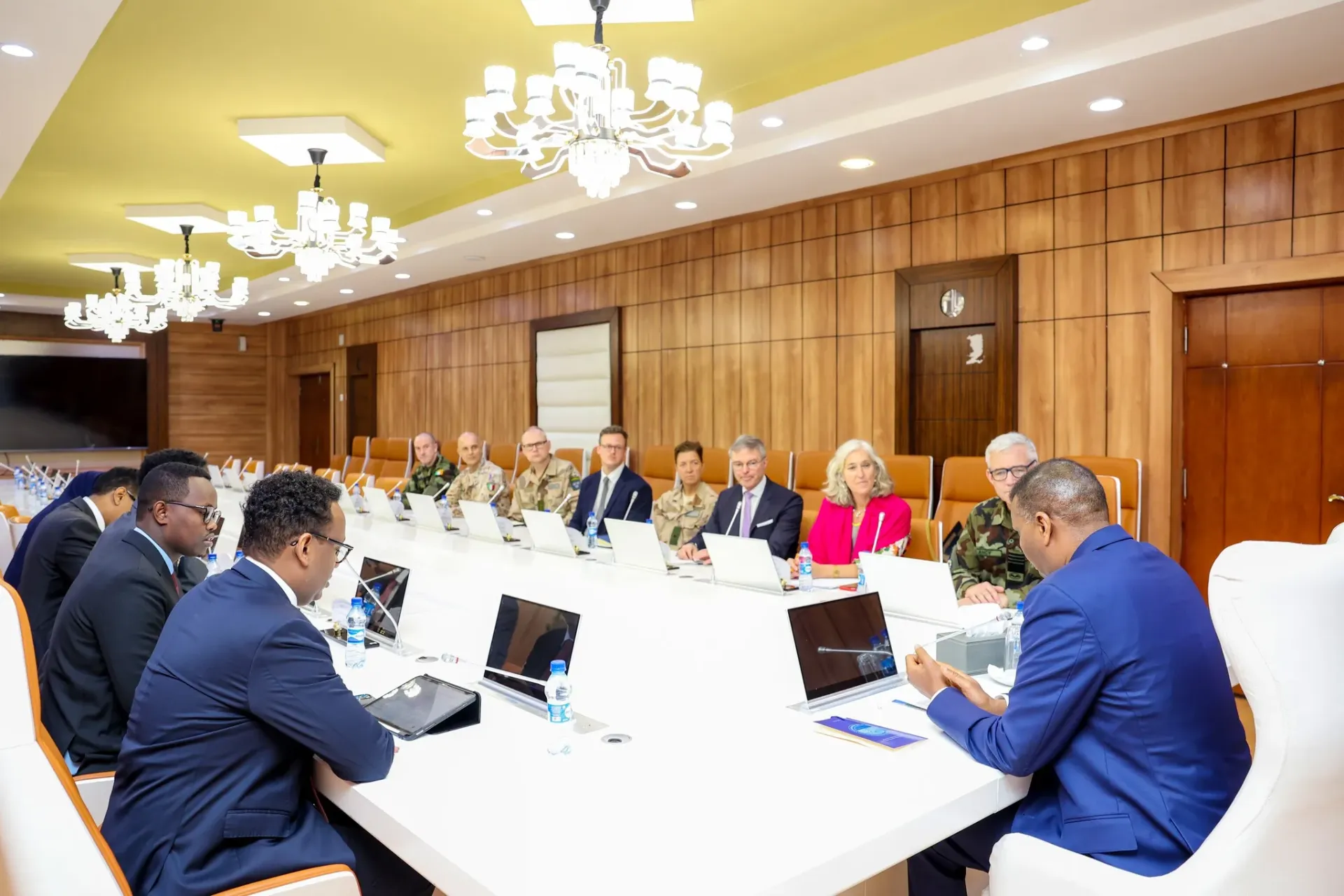Sidoo kale, Ra’iisul Wasaaruhu wuxuu sheegay in xukuumadda ay ka go’an tahay hirgelinta dimuqraadiyadda iyo in shacabka Soomaaliyeed dib loogu celiyo awoodda doorashada hoggaankooda. Wafdiga Midowga Yurub ayaa dhankooda ballan qaaday taageerada hey’adaha amniga, tababbarka ciidamada iyo geeddi-socodka dowlad-dhiska, iyagoo sidoo kale soo dhoweeyay gogosha wadahadal ee ay fidisay xukuumaddu.