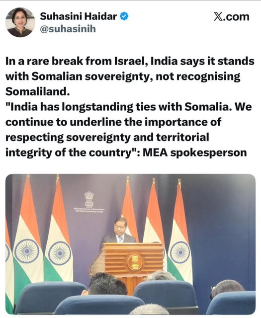“Waxaan sii adkaynaynaa muhiimadda ay leedahay in la ixtiraamo madax-bannaanida iyo wadajirka dhuleed ee Jamhuuriyadda Federaalka Soomaaliya,” ayuu yiri Afhayeenka Wasaaradda Arrimaha Dibadda Hindiya, Randhir Jaiswal.