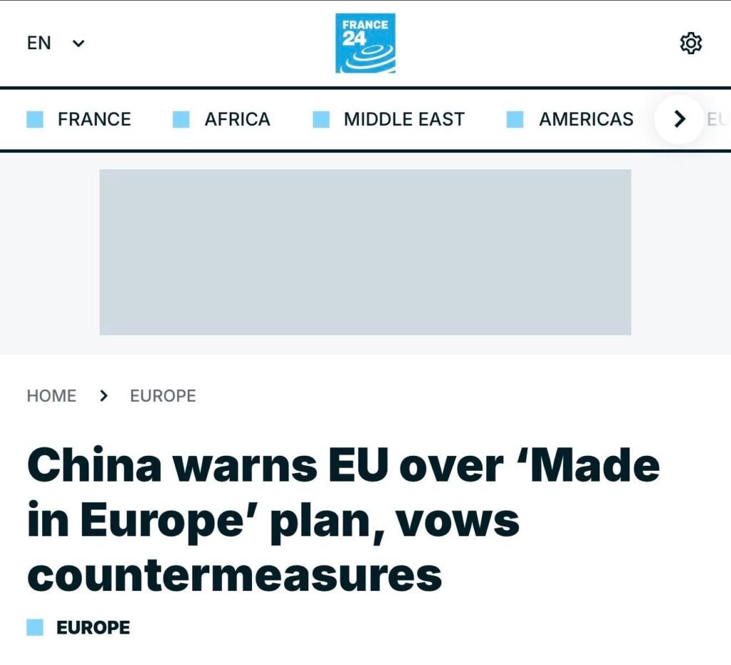 Dhanka kale dawlada Shiinaha ayaa maanta ugu hanjabay Midowgow Yurub inuu qaadayo tallaabooyin ka dhan ah, haddii ay dhaqangeliyaan sharciga mudnaanta siinaya wax soosaarka gudaha Yurub oo meesha ka saaraya soo dhoofsashada dibadda, ka dib markii Midowga Yurub uu sheegay inay hirgelinayaan nidaamka wax iibsiga waxyaabaha lagu sameeyay gudaha Yurub, taasoo meesha ka saaraysa in ka badan 300 bilyan oo sannad walba uu Shiinaha ka faa’iideyay suuqyada Yurub.