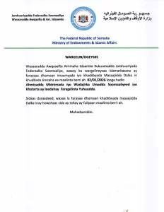 Wasaaradda Awqaafta iyo Arrimaha Islaamka ee Xukuumadda Federaalka Soomaaliya ayaa farriin rasmi ah u dirtay dhammaan imaamyada iyo khadiibyada masaajidda dalka, taas oo ay ku farayso in khudbada Jimcaha ee berrito oo ku beegan 02/01/2026 si gaar ah looga hadlo ahmiyadda midnimada iyo wadajirka umadda Soomaaliyeed, iyo sidoo kale khatarta ay leedahay faragelinta Isra’iil.
