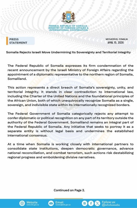 “Dowladda Federaalku waxay si cad u diidaysaa isku day kasta oo lagu bixinayo aqoonsi diblomaasiyadeed ama siyaasadeed qayb kasta oo ka mid ah dhulkeeda; Somaliland waxay weli tahay qayb muhiim ah oo ka mid ah Jamhuuriyadda Federaalka ee Soomaaliya. Cid kasta oo doonaysa in ay u muujiso inay tahay gaar waa mid aan sal sharci lahayn, kana hor imanaysa axdiga caalamiga.” — MOFA.