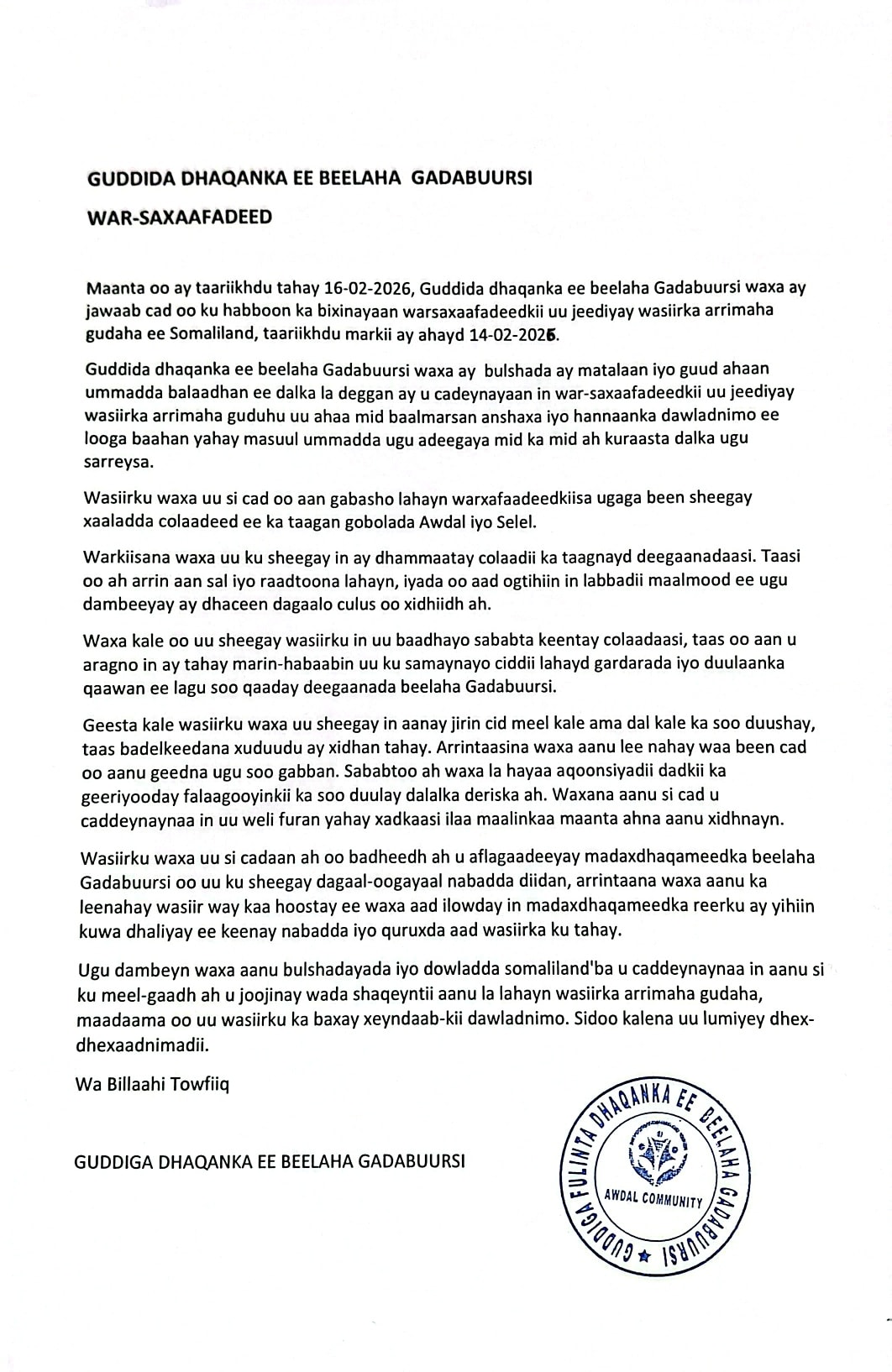 Deg Deg Gudiga Dhaqanka Beelaha Gadabuurso Oo Soo Saaray Go’aamo Masiiriya Waxayna Bayaanka Ku Sheegeen In Ay Si Kumeel Gaadh Ah u Joojiyeen Wadashaqayntii Wasiirka Arimaha Gudaha Somaliland Cabdale Sandheere
