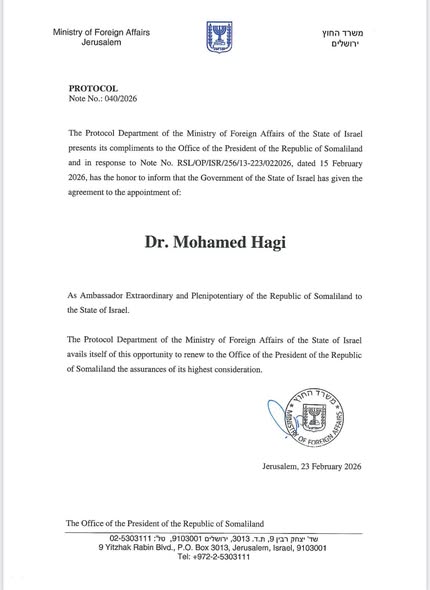 IsraIl ayaa aqbashay nin lagu magacaabo Dr Maxamed Xaaji inuu noqdo safiirka Somaliland ufadhiyo Tel Aviv. Tani ayaa kusoo aadeysa kahor booqashada Cirro uu kutagi doono IsraIl dhamaadka bisha Maarso.