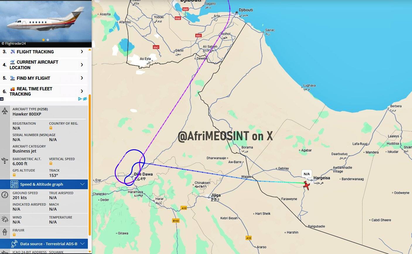 Diyaarad khaas ah oo nooca Hawker 800XP ah, kuna diiwaangashan lambarka T7-NKS, ayaa maanta ka soo duushay garoonka caalamiga ah ee Ben Gurion ee Israa’iil , iyadoo ku wajahneyd Hargeysa, Somaliland.