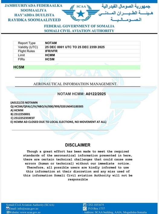 Hay’adda Duulista Rayidka Soomaaliya (SCAA) ayaa si rasmi ah ugu dhawaaqday in Garoonka Diyaaradaha Caalamiga ah ee Aadan Cadde ee magaalada Muqdisho la xiri doono maalin qura, Khamiista 25-ka Diseembar 2025, sababo la xiriira qabsoomidda doorashooyinka ka dhacaya caasimadda.