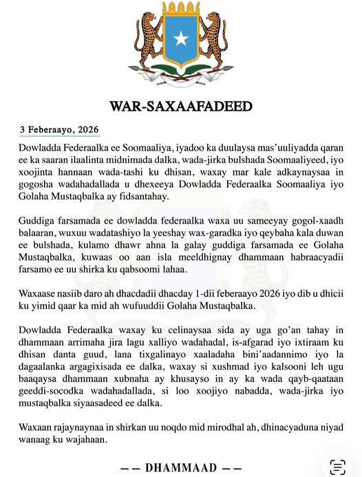 Dowladda fadaralka Soomaliya ayaa Warsaxaafadeed aay soo saartey Mar kale adkeysay Qabsaamida Gugusha Wada hadalka Ee u Dhuxeexysa DFS iyo Gololha Mustaqbalka, iyadoo nasiib daro ku tilmaantay Celintii Ciidanka.