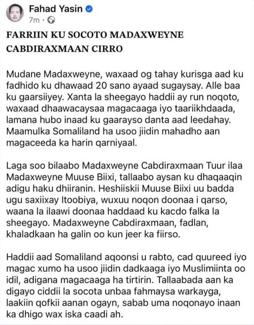 Haddii aad Somaliland aqoonsi u rabto, cad quureed iyo magac xumo ha usoo jiidin dadkaaga iyo Muslimiinta oo idil, adigana magacaaga ha tirtirin. Tallaabada aan ka digayo ciddii la socota unbaa fahmaysa warkayga, laakiin qofkii aanan ogayn.”