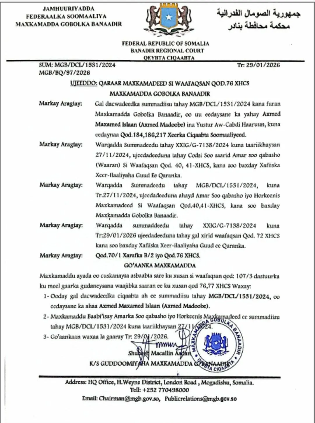 Go’aan Maxkamadeed Ee soo Qabashada Axmed Madoobe oo si Rasmi ah loo baabi’iyey