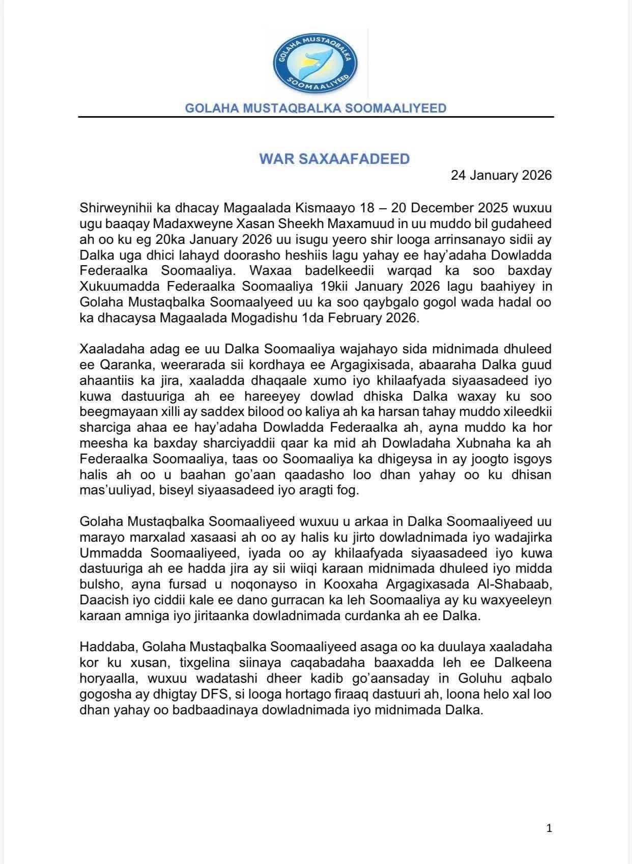Golaha Mustaqbalka ayaa ku baaqay in la sii xoojiyo wada-shaqeynta dowladda Federaalka iyo maamul goboleedyada, si loo helo xalal waara oo ka tarjumaya rabitaanka shacabka Soomaaliyeed.