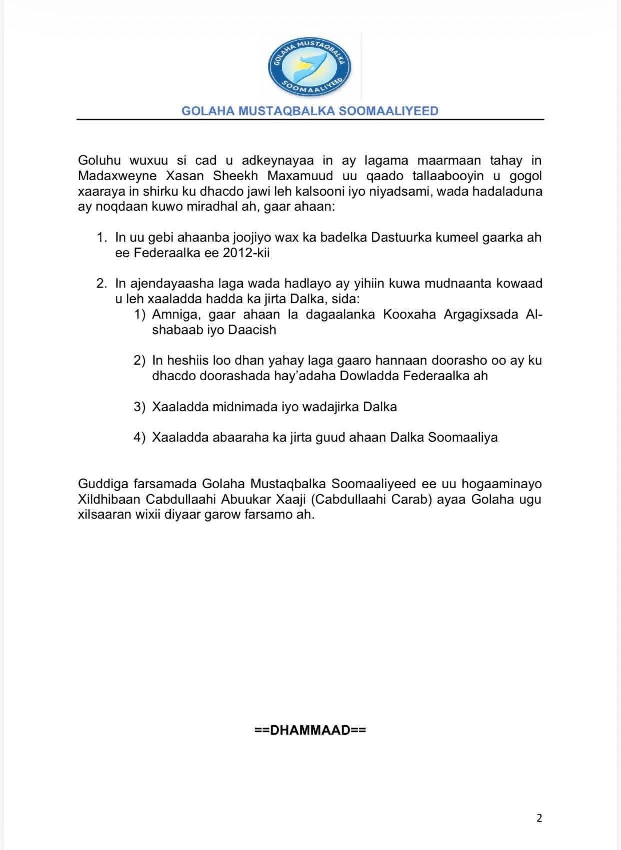 Shirka golaha ayaa laga soo saaray warqad aqbalaad ah oo ku saabsan gogosha ay dowladda u fidisay wada-hadallada, iyagoo isla markaana ku booriyay Madaxweynaha Soomaaliya in uu joojiyo dhaq-dhaqaaqa wax ka beddelka dastuurka. Golaha ayaa ku adkeeyay muhiimadda ay leedahay in la dhowro hanaanka dimoqraadiyadda iyo wada-tashiga dhammaan qeybaha bulshada, si loo gaaro heshiis siyaasadeed oo waara.