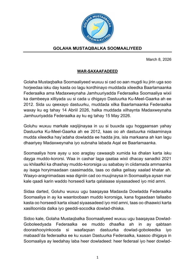 Golaha Mustaqbalka Soomaaliyeed wuxuu ku booriyay madaxda dowladda federaalka, siyaasiyiinta iyo dhammaan dhinacyada ay khusayso in ay ka fogaadaan tallaabo kasta oo keeni karta dib-u-dhac doorasho ama muran siyaasadeed, isla markaana ay ilaaliyaan dastuurka iyo nidaamka dowladnimo ee dalka.