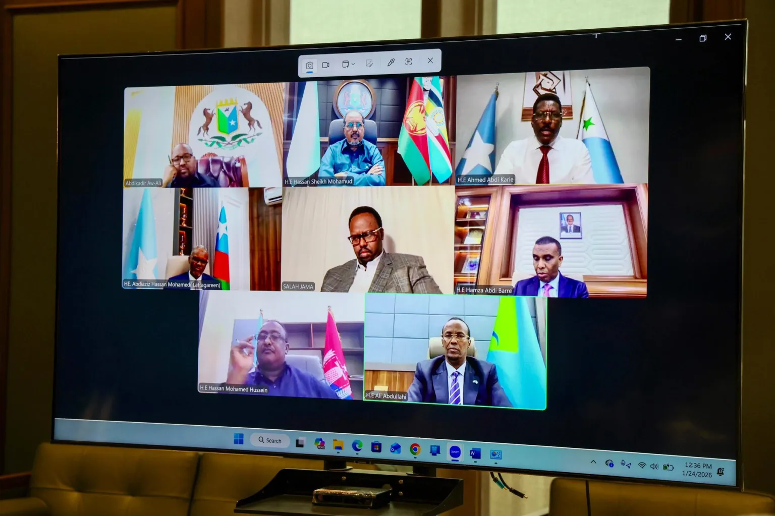 Madaxweynaha Jamhuuriyadda Federaalka Soomaaliya Dr. Xasan Sheekh Maxamuud ayaa guddoomiyey shirka Golaha Wadatashiga Qaran (GWQ) oo ay qaab fogaan arag ah ku yeesheen maanta oo taariikhdu tahay Janaayo 24, 2026. Shirka waxaa ka soo qaybgalay Ra’iisul Wasaaraha XJFS Mudane Xamza Cabdi Barre, Ra’iisul Wasaare Ku-xigeenka XJFS Mudane Saalax Axmed Jaamac, Madaxweynaha Koonfur Galbeed Mudane Cabdicasiis Xasan Maxamed (Lafta-gareen), Madaxweynaha Galmudug Mudane Axmed Cabdi Kaariye (Qoorqoor), Madaxweynaha Hirshabeelle Mudane Cali Cabdullaahi Xuseen (Cali Guudlaawe), Madaxweynaha Waqooyi Bari Soomaaliya Mudane Cabduqaadir Axmed Aw-Cali iyo Guddoomiyaha Gobolka Banaadir ahna duqa Muqdisho Mudane Xasan Maxamed Xuseen (Muungaab).