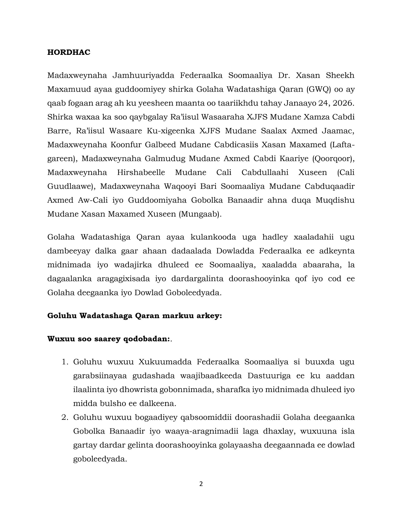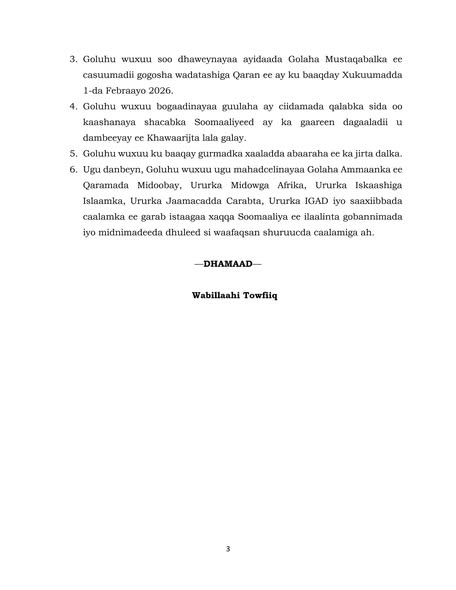 3-Goluhu wuxuu soo dhaweynayaa ayidaada Golaha Mustaqabalka ee casuumadii gogosha wadatashiga Qaran ee ay ku baaqday Xukuumadda 1-da Febraayo 2026.