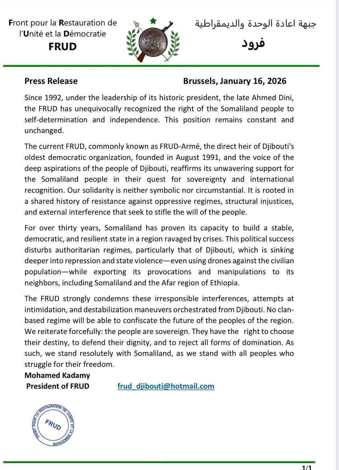 Guddoomiyaha Jabhadda FRUD ee Dagaalka Kula Jirta Jabuuti Maxamed Kadamy, Ayaa Taageeray Aqoonsiga ay Ka heshay Israaiil iyo Dawladnimada Somaliland, waxana uu sidaasi ku sheegay War Saxaafadeed uu Soo saaray.