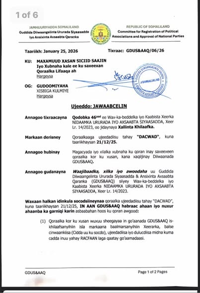 Guddida Diiwaangelinta Ururada Siyaasadda iyo Ansixinta Axsaabta Qaranka ayaa manta soo saartay go’aan ay ku diidey dacwad ay soo qorteen xubno ka tirsan Xisbiga KULMIYE