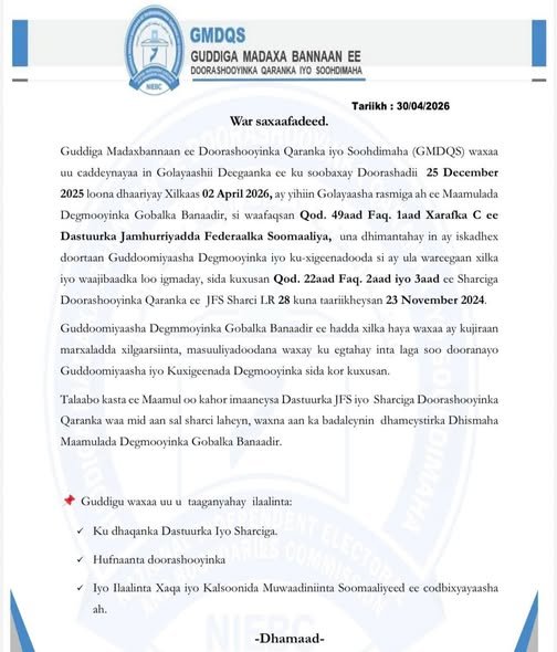 Guddiga ayaa sheegay inaan la aqbali doonin talaabo kasta oo si toos ah uga hor imaanayso habraacyada iyo xeerarka doorashooyinka dalka, gaar ahaan qodobada dastuurka iyo sharciga doorashooyinka ee dhigaya in xilalka noocaas ah lagu saleeyo hannaan doorasho oo hufan.