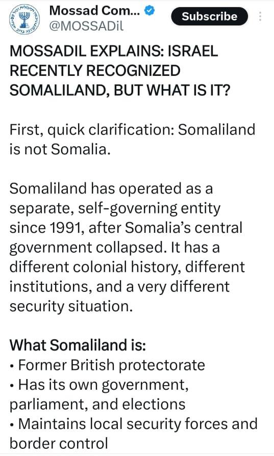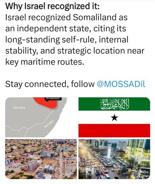 Hayada Sirdoonka Israel Oo Cadeysay Sababta Aqoonsiga loo Siiyay Somaliland December 27, 2025 Hay’adda Sirdoonka Israelee MOSSADIL ayaa Cadaysay inaanay Somaliland ka mid ahayn soomaaliya. waxa kale oo ay ka hadleen sababta ay ictiraafka u siiyeen somaliland.