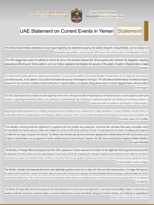 UAE waxay carrabka ku adkaysay in mowqifkeedu tan iyo bilowgii dhacdooyinka gobollada Xadramawt iyo Al-Mahra uu ahaa in la dejiyo xaaladda, iyadoo si dhow ula shaqaynaysa walaalaheeda Boqortooyada Sacuudi Carabiya.