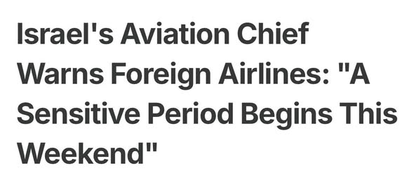 Madaxa hay’adda duulista hawada Israa’iil, Shmuel Zakai ayaa maanta u sheegay shirkadaha diyaaradaha caalamiga ah in dhammaadka toddobaadkan uu noqon doono mid xasaasi ah, isla markaana ay jiri karto halis amni. sida ay Warbaahinta Israa’iil ku warrantay maanta.