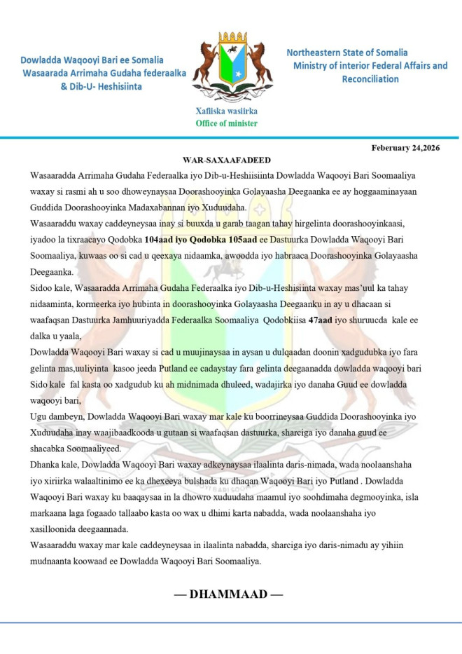 Wasaaradda Arrimaha Gudaha, Federaalka iyo Dib-u-heshiisiinta ee Dowlad Goboleedka Waqooyi Bari Soomaaliya ayaa si rasmi ah u shaacisay qabsoomidda Doorashooyinka Goleyaasha Deegaanka, kuwaas oo ay hoggaaminayso guddiga doorashooyinka iyo soohdimaha Soomaaliya.