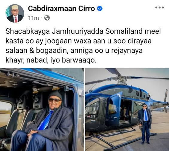 Madaxweynaha Soomaaliland,Cabdiraxmaan Cirro ayaa xaqiijiyay inuu ku suganyahay dalka Switzerland, kaddib markii uu baahiyay sawirka diyaarad nooca qumaatiga u kacda oo ay leedahay shirkadda Air Zermatt.