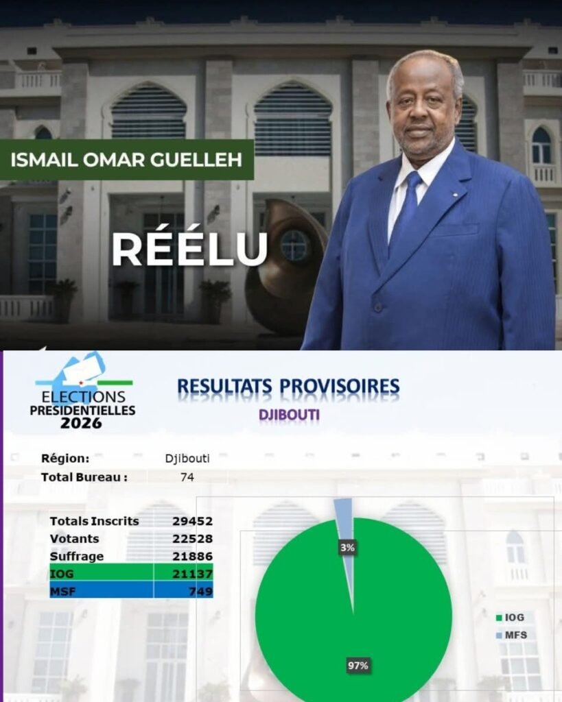 Madaxweyne Geelle ayaa markii lixaad ku guuleysatay Madaxweynaha Jamhuuriyadda Jabuuti, isaga oo heley 97% codadka la dhiibtay, halka Musharraxa la tartamay Mr.Samatar uu heley 3% oo keli ah, sida ay shaaciyeen Guddiga Doorashada Jabbuuti.