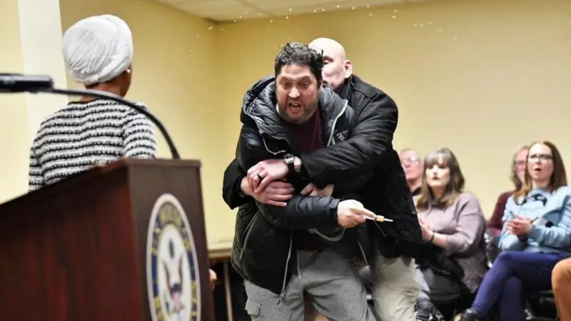 Waxaa lagu soo oogay dacwad ah in uu weeraray oo uu farageliyay xubin ka tirsan Congress-ka markii uu u yimid Ilhaan Cumar oo ah 43 iyada oo taagnayd halka laga khudbeeyo, wuxuuna isticmaalay saliingo caag ah, kaasoo uu uga buufiyey xabadka iyo caloosha, wax markii dambe la go’aamiyay inuu yahay isku dar ah khalka tufaaxa iyo biyo.