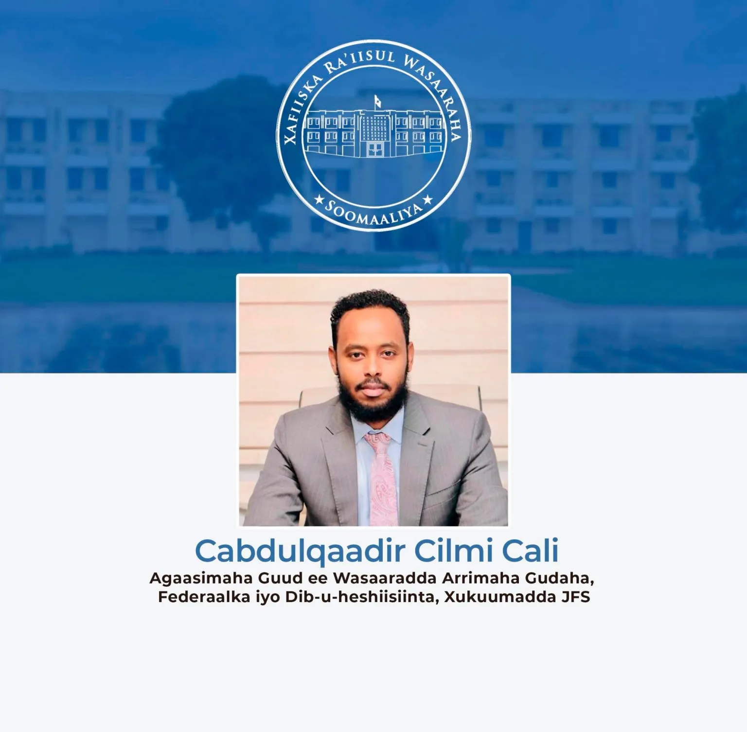 Ra’iisul Wasaaraha Xukuumadda Jamhuuriyadda Federaalka Soomaaliya, Mudane Xamsa Cabdi Barre, ayaa maanta u magacaabay Mudane Cabdulqaadir Cilmi Cali xilka Agaasimaha Guud ee Wasaaradda Arrimaha Gudaha, Federaalka iyo Dib-u-Heshiisiinta.