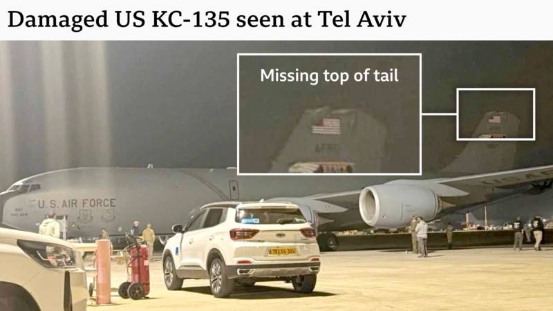 Sawirro la xaqiijiyay ayaa muujinaya burburka diyaarad Mareykan ah oo ku sugan Israa’iil Kadib markii ciidamada Cirka ee Maraykanka ee KC-135 oo shidaal ku shubaya diyaarad ay waxyeelo ka soo gaadhay qaybta danbe, si gaar ah baalasheeda oo taagan garoonka Ben Gurion ee Tel Aviv, Israel.