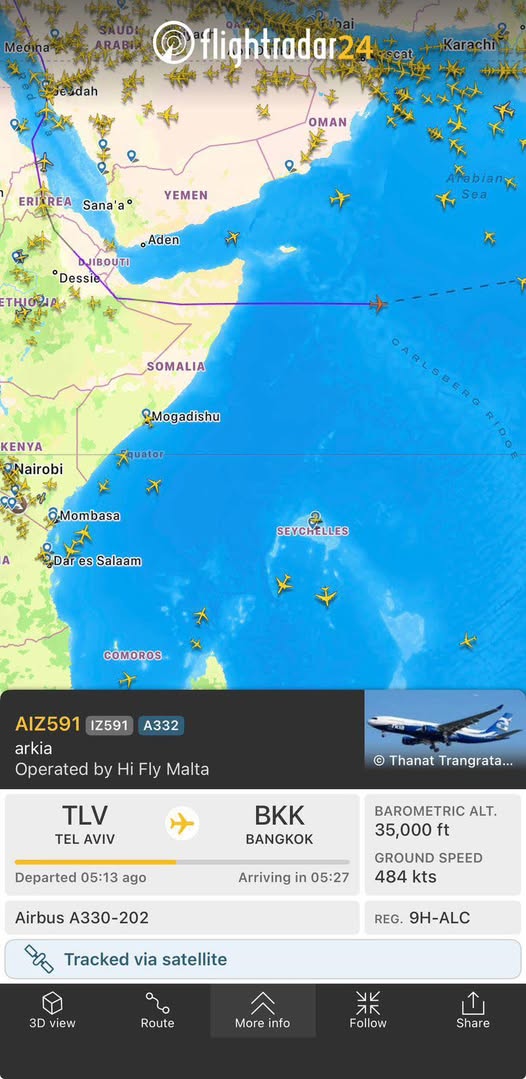 Duulimaadkan maanta ayaa ka soo kacay magaalada Tel Aviv, waxaana uu ku wajahan yahay magaalada Bangkok ee dalka Thailand, isaga oo maraya marinadii hawada ee caadiga ahaa ee gobolka.