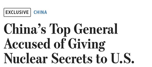 Wargeyska The Wall Street Journal ayaa sheegay in sirdoonka Shiinaha ay baaritaan ku wadaan mid ka mid ah jeneraalada ugu sarreeya ciidanka Shiinaha, oo lagu magacaabo ,Jen. Zhang Youxia kaas oo lagu eedeeyay dembi culus oo la xiriira inuu sirta nukliyeer ee Shiinaha ah u gudbiyay Mareykanka.