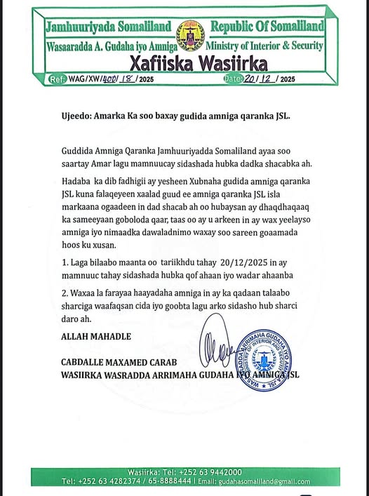 Wasiirka arrimaha gudaha Somaliland ayaa sheegay in tallaabo sharciga waaafaqsan laga qaadi doono cidkasta oo lagu arko isagoo hub sita qof ahaan iyo wadar ahaan ba.