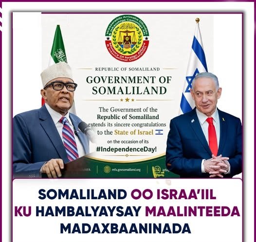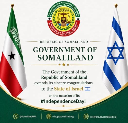 Wasaaradda Arrimaha Dibadda iyo Iskaashiga Caalamiga ah ee Jamhuuriyadda Somaliland ayaa hambalyo u dirtay dowladda Israa’iil munaasabadda Sanad guurada 78- ee ka soo wareegtay maalinta madax-bannaanideeda.