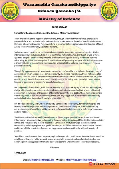 Somaliland waxay hadalladaas ku tilmaantay kicin dagaal iyo ku xadgudub sharciga caalamiga ah, isla markaana khatar ku ah amniga Geeska Afrika.
