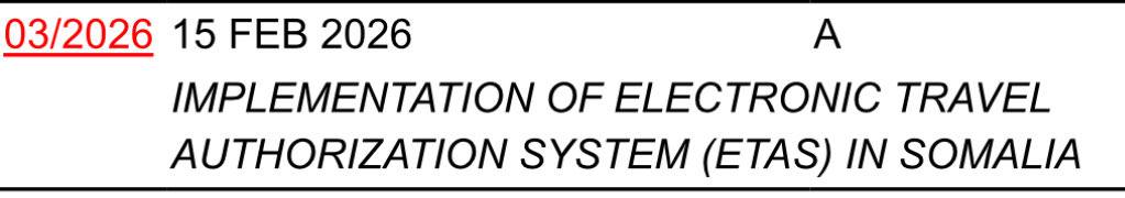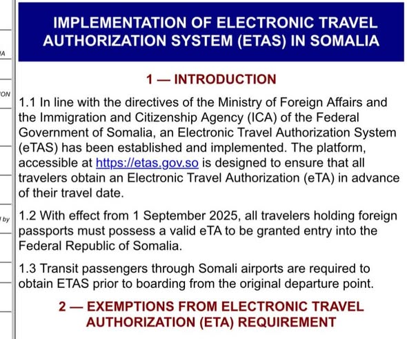 Dowladda Federaalka Soomaaliya ayaa si rasmi ah u dhaqan gelisay nidaamka cusub ee Electronic Travel Authorisation (ETA) laga bilaabo 15-ka Febraayo 2026, kadib qorshe hore oo loo shaaciyay in la hirgelinayo dabayaaqadii sanadkii 2025.