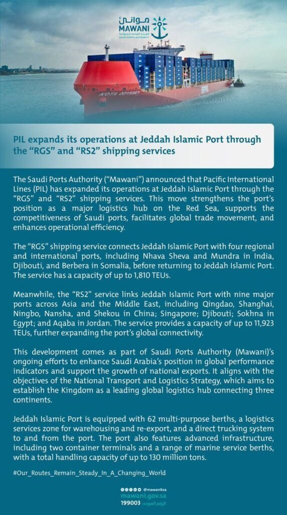Hay’adda Saudi Ports Authority (“Mawani”) ayaa shaaca ka qaaday in shirkadda Pacific International Lines (PIL) ay balaadhisay adeegyada maraakiibta ee “RGS” iyo “RS2” ee dekedda Jeddah Islamic Port. Tani waxay Soomaaliya iyo guud ahaan gobolka Geeska Afrika ka caawinaysaa helitaanka isku xirka ganacsi ee caalamiga ah.