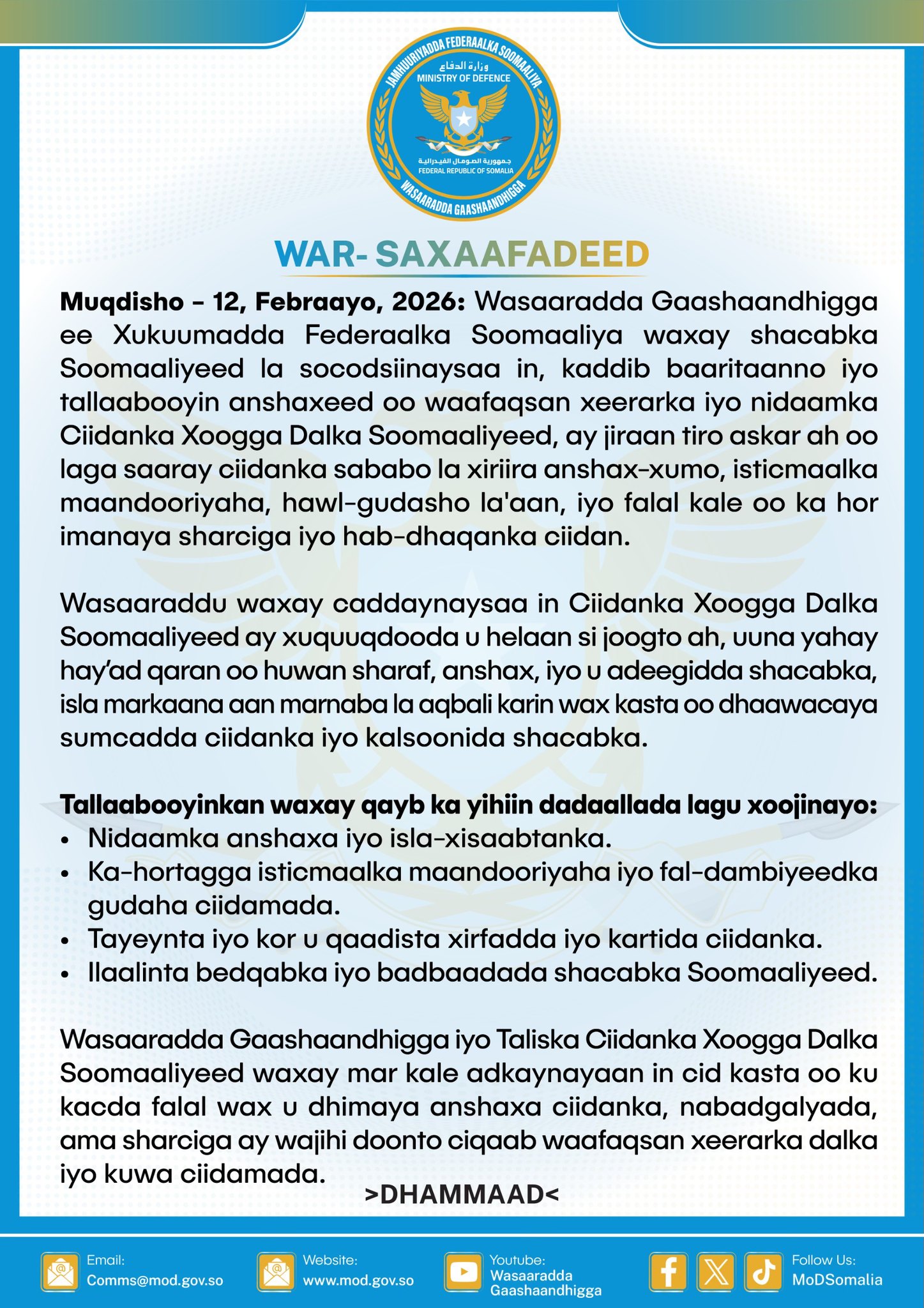 Wasaaradda Gaashaandhigga ee Xukuumadda Federaalka Soomaaliya waxay shacabka Soomaaliyeed la socodsiinaysaa in, kaddib baaritaanno iyo tallaabooyin anshaxeed oo waafaqsan xeerarka iyo nidaamka Ciidanka Xoogga Dalka Soomaaliyeed, ay jiraan tiro askar ah oo laga saaray ciidanka sababo la xiriira anshax-xumo, isticmaalka maandooriyaha, hawl-gudasho la’aan, iyo falal kale oo ka hor imanaya sharciga iyo hab-dhaqanka ciidan.