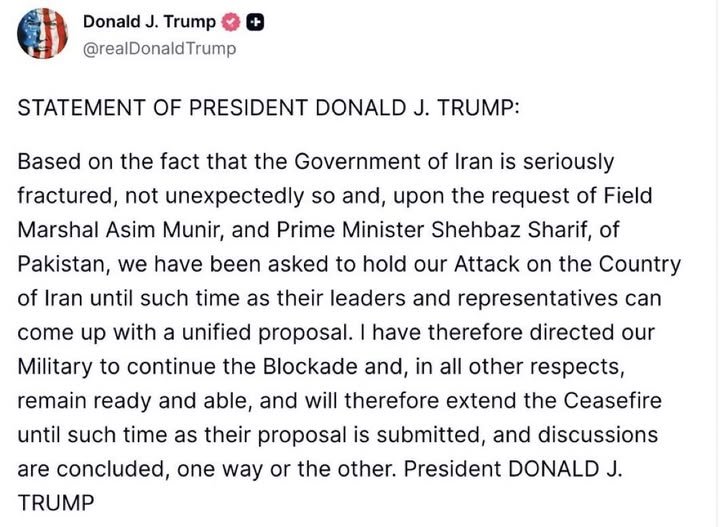 Qoraal uu ku daabacay bartiisa truth,Trump ayaa waxa uu ku sheevay in uu codsi uga yimid Ra’isalwasaaraha Pakistan iyo taliyaha Ciidanka Pakistan uu ku kordhiyay waqtiga xabad-joojinta oo ku ekayd bari Arbacada.