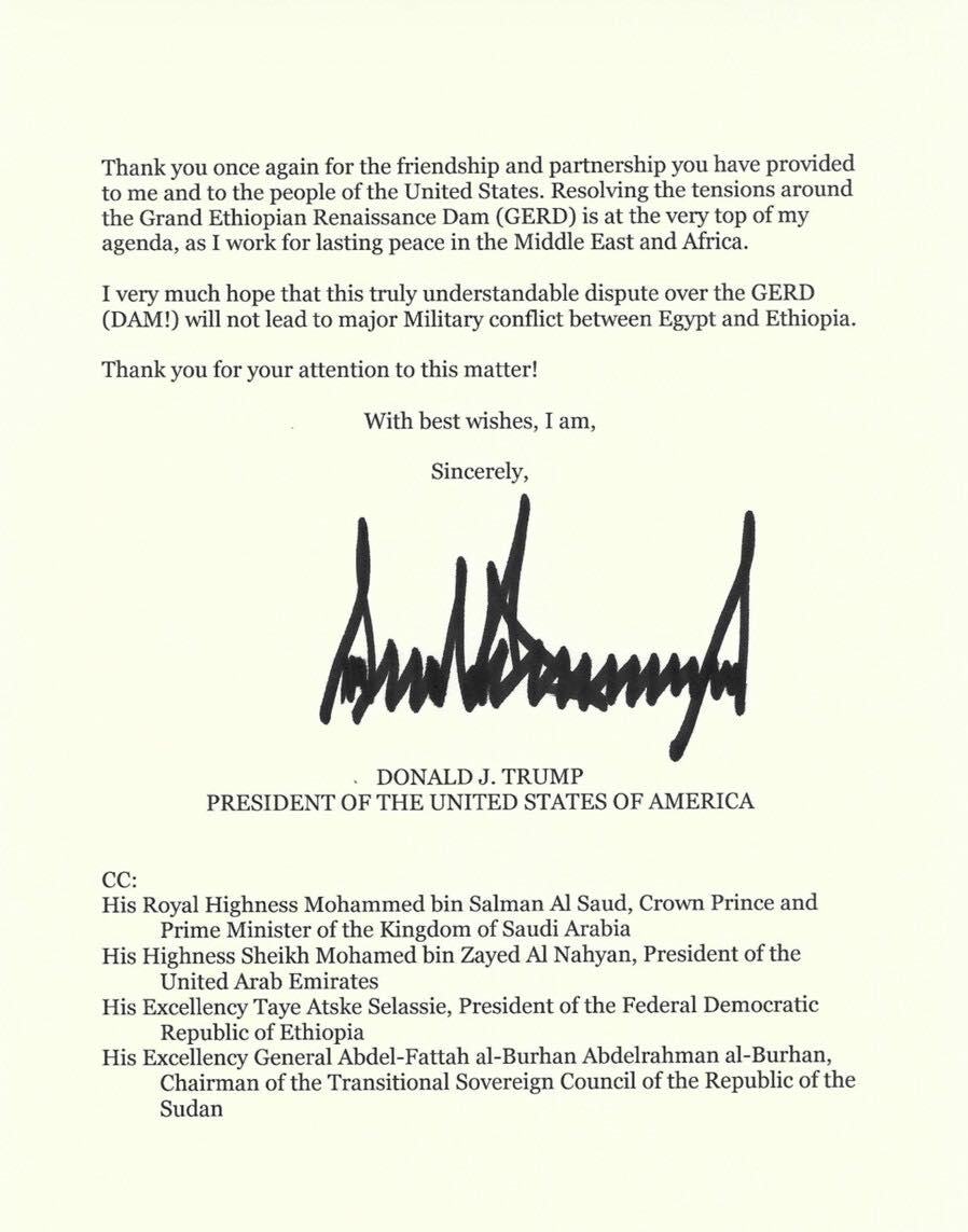 Aqalka cad ee maraykanka ayaa warqad codsi ah oo ka socota Trump kuna socota Sisi oo uu ku saxeexan yahay Trump, taas oo kaga dalbanaayey in uu bilaabo dhexdhexaadin u dhaxaysa Masar iyo Itoobiya, iyada oo warqadan ogasiis ahaana loogu diray madax kale oo carbeed.
