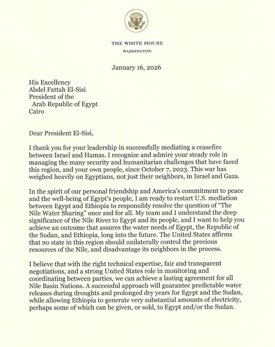 Iyadoo la tixraacayo saaxiibtinnimadeenna shaqsiyadeed iyo ballanqaadka Maraykanka ee nabadda iyo daryeelka wanaagga shacabka Masar, waxaan diyaar u ahay inaan dib u bilaabo dhexdhexaadinta Mareykanka ee u dhexeysa Masar iyo Itoobiya si si masuuliyad leh loogu xalliyo arrinta “Qaybsiga Biyaha Niilka” hal mar iyo gebi ahaanba. Aniga iyo kooxdaydu waxaan si qoto dheer u fahamsanahay muhiimadda weyn ee Webiga Niil u leeyahay Masar iyo dadkeeda, waxaanan doonayaa inaan kaa caawiyo inaad gaarto natiijo hubinaysa baahida biyaha ee Masar, Jamhuuriyadda Suudaan, iyo Itoobiya mustaqbalka fog. Mareykanku wuxuu xaqiijinayaa in aysan jirin dowlad ku taalla gobolkan oo si keligeed ah u xakameyn karta kheyraadka qaali ah ee Niilka, iyadoo dhibaato u geysanaysa deriskeeda inta lagu jiro geeddi-socodkaas.
