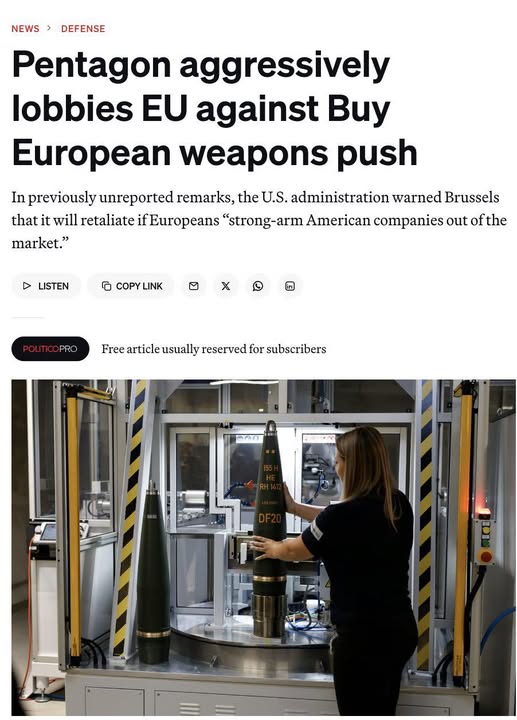 Mareykanka ayaa si cad uga digay oo ku hanjabay inuu tallaabo qaadi doono haddii la hirgeliyo iskudayga ururka Midowga Yurub uu ku soo saarayo sharci ku waajibinaya dalalka Yurub inay kaliya iibsadaan wax soosaarka difaaca ee dalalka Yurub, meeshana laga saaro iibsashada hubka Mareykanka,iyadoo Mareykanka uu sheegay go’aankan inay ka dhalan karto in dalalka Yurub laga saaro heshiisyada difaac ee ay kula jiraan Mareykanka, sida uu weriyey wargeyska Politico.
