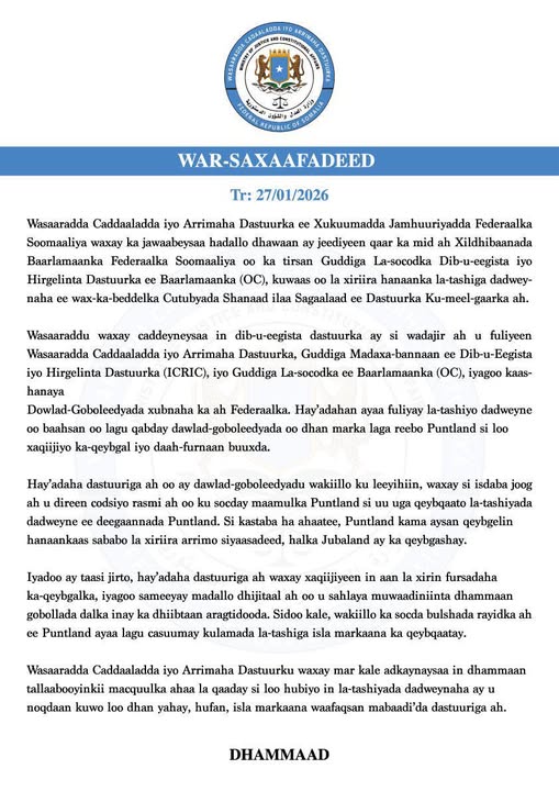 Muqdisho, 27 Janaayo 2026: Wasaaradda Caddaaladda iyo Arrimaha Dastuurka ee Xukuumadda Jamhuuriyadda Federaalka Soomaaliya waxay ka jawaabeysaa hadallo dhawaan ay jeediyeen qaar ka mid ah Xildhibaanada Baarlamaanka Federaalka Soomaaliya oo ka tirsan Guddiga La-socodka Dib-u-eegista iyo Hirgelinta Dastuurka ee Baarlamaanka (OC), kuwaas oo la xiriira hanaanka la-tashiga dadweynaha ee wax-ka-beddelka Cutubyada Shanaad ilaa Sagaalaad ee Dastuurka Ku-meel-gaarka ah.