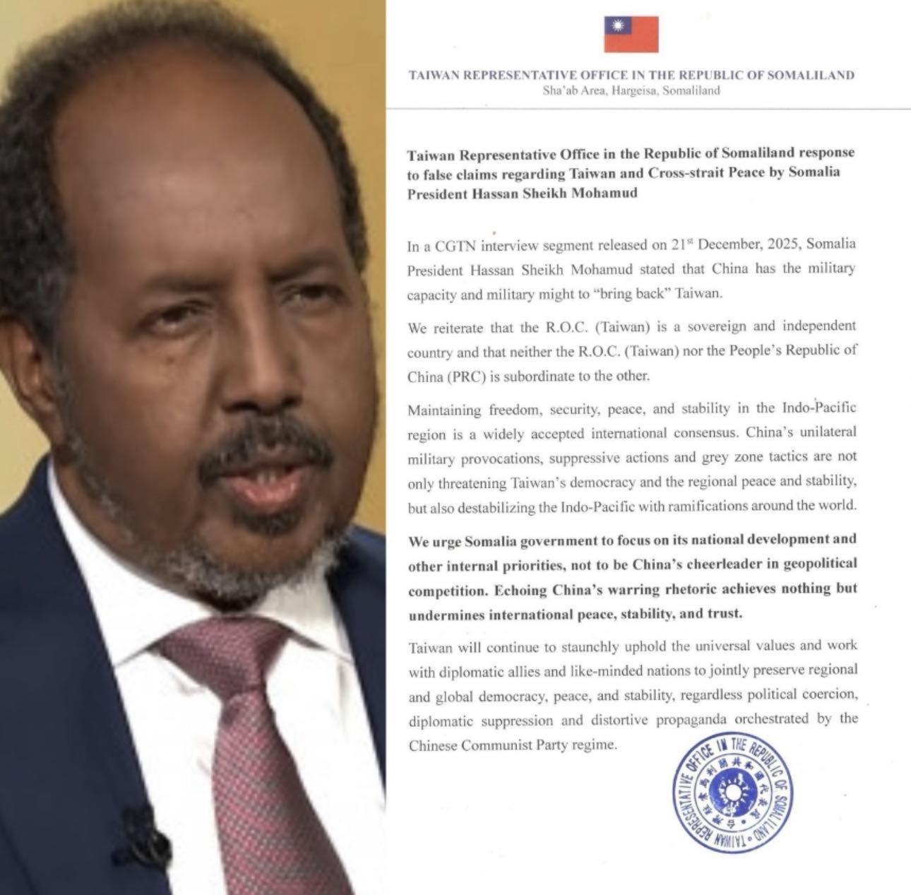 Xafiiska Taiwan ee Jamhuuriyadda Somaliland ayaa si adag uga jawaabay hadal uu jeediyey Madaxweynaha Soomaaliya Xasan Sheekh Maxamuud, kaas oo la xidhiidha arrinta Taiwan iyo Shiinaha.